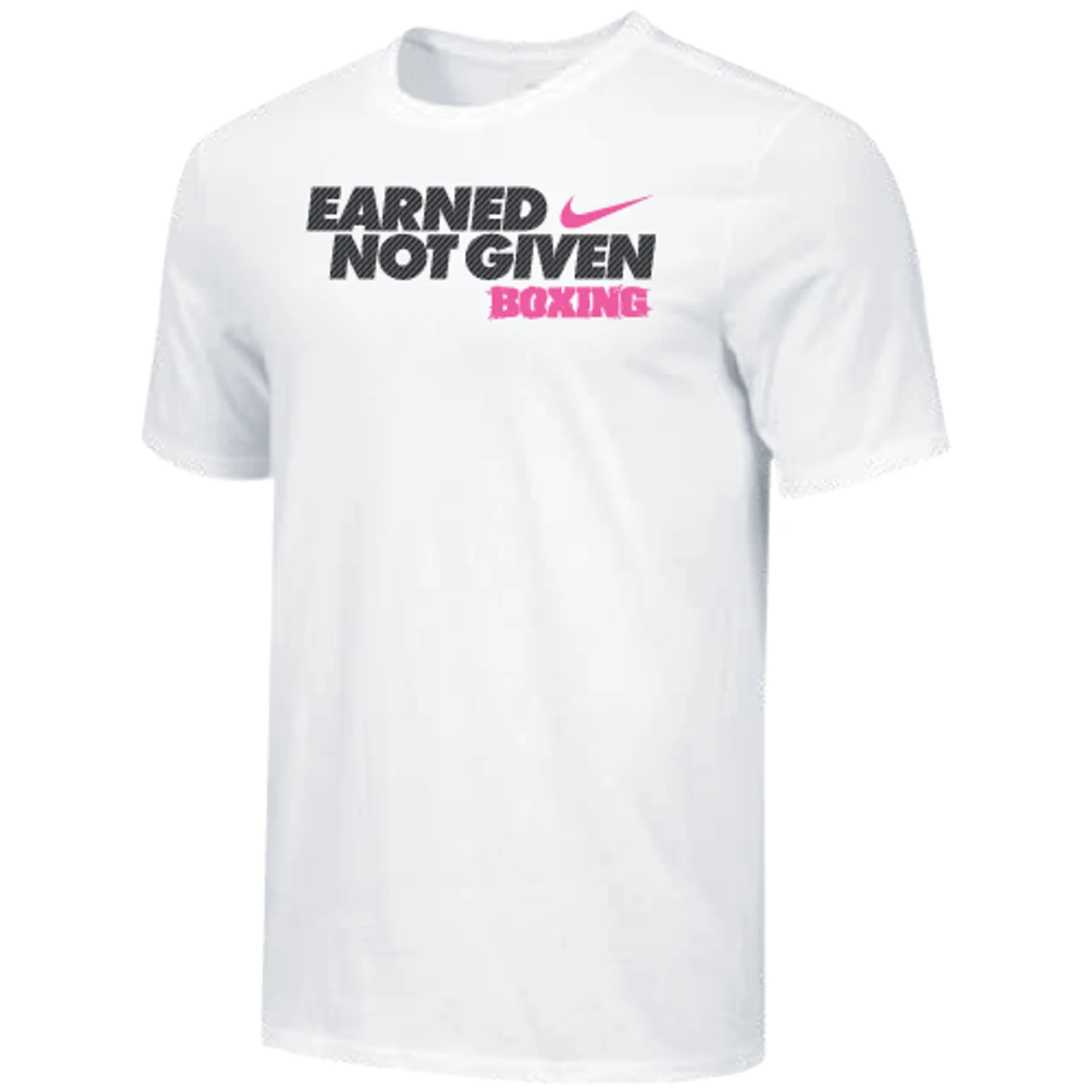 Nike Men’s Boxing Earned Not Given Tee – White/Black/Pink – Form and function combine for a modernized look with less bulk in the Nike 100% Premium Ring Spun Cotton Tee.