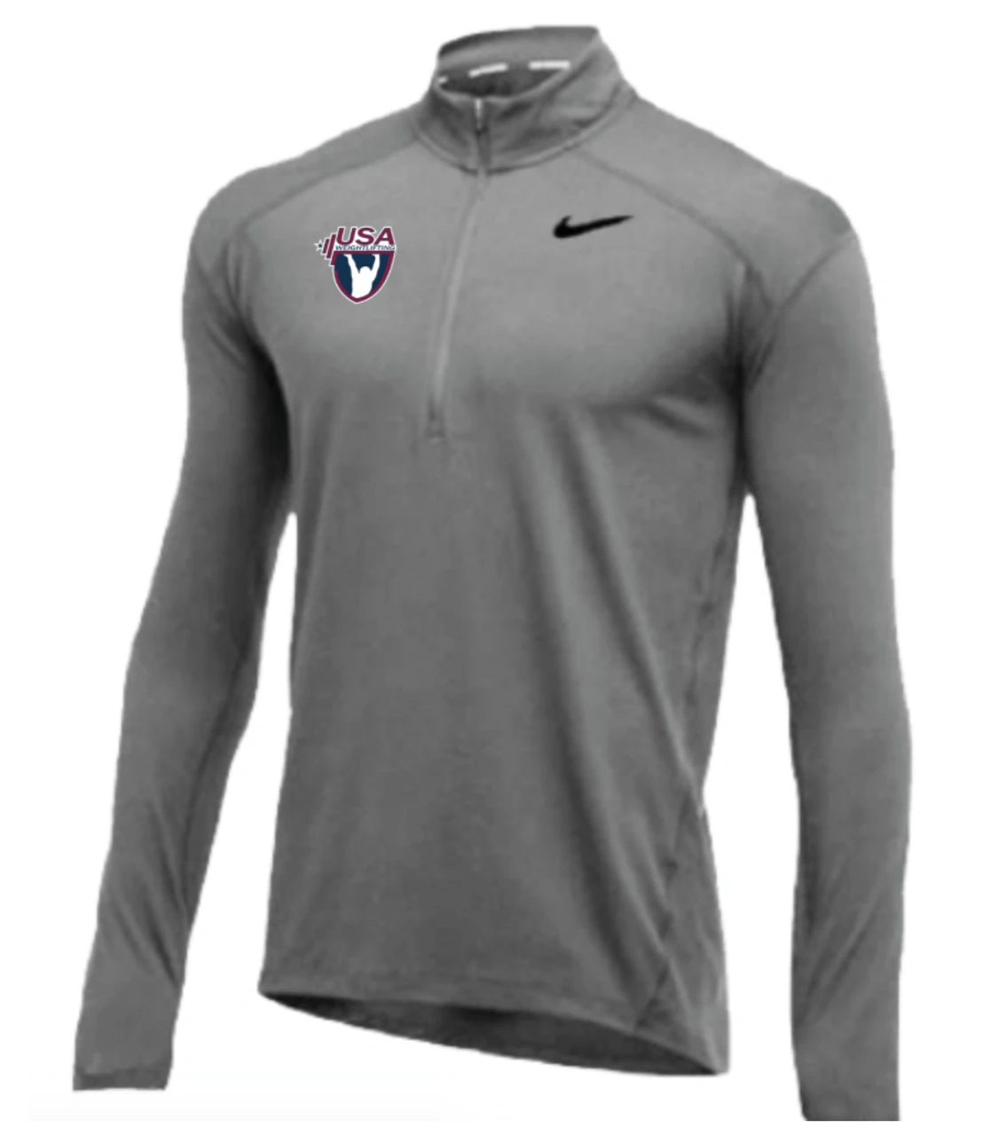 Nike Men’s USA Weightlifting 1/2 Zip Top – Grey – Nike Dri-FIT technology helps you stay dry and comfortable. 1/2-zip design with a mock neck provides versatile coverage. Interior tape moves smoothly against your skin. Swoosh design trademark is printed on the right chest. 100% POLYESTER.