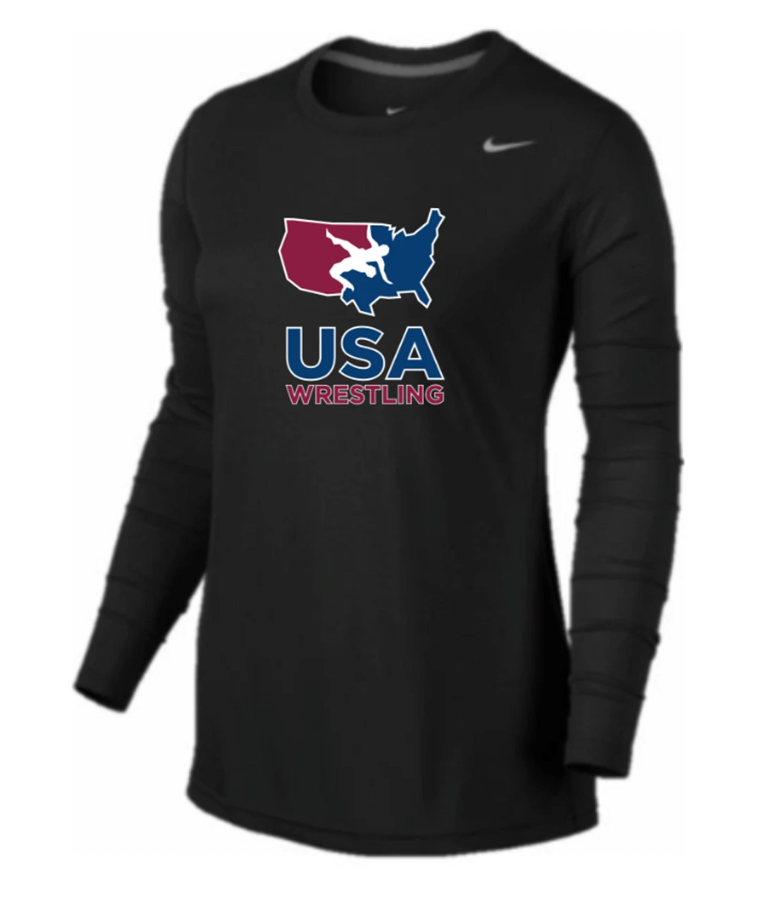 Nike Women’s USA Wrestling Legend LS Crew – Black/Black/Cool Grey – A LEGENDARY PERFORMER. Featuring a streamlined silhouette and sweat-wicking technology, the Nike Legend Women’s Long-Sleeve Training Top is a versatile, high-performance layer designed to help you elevate your training game. 100% POLYESTER