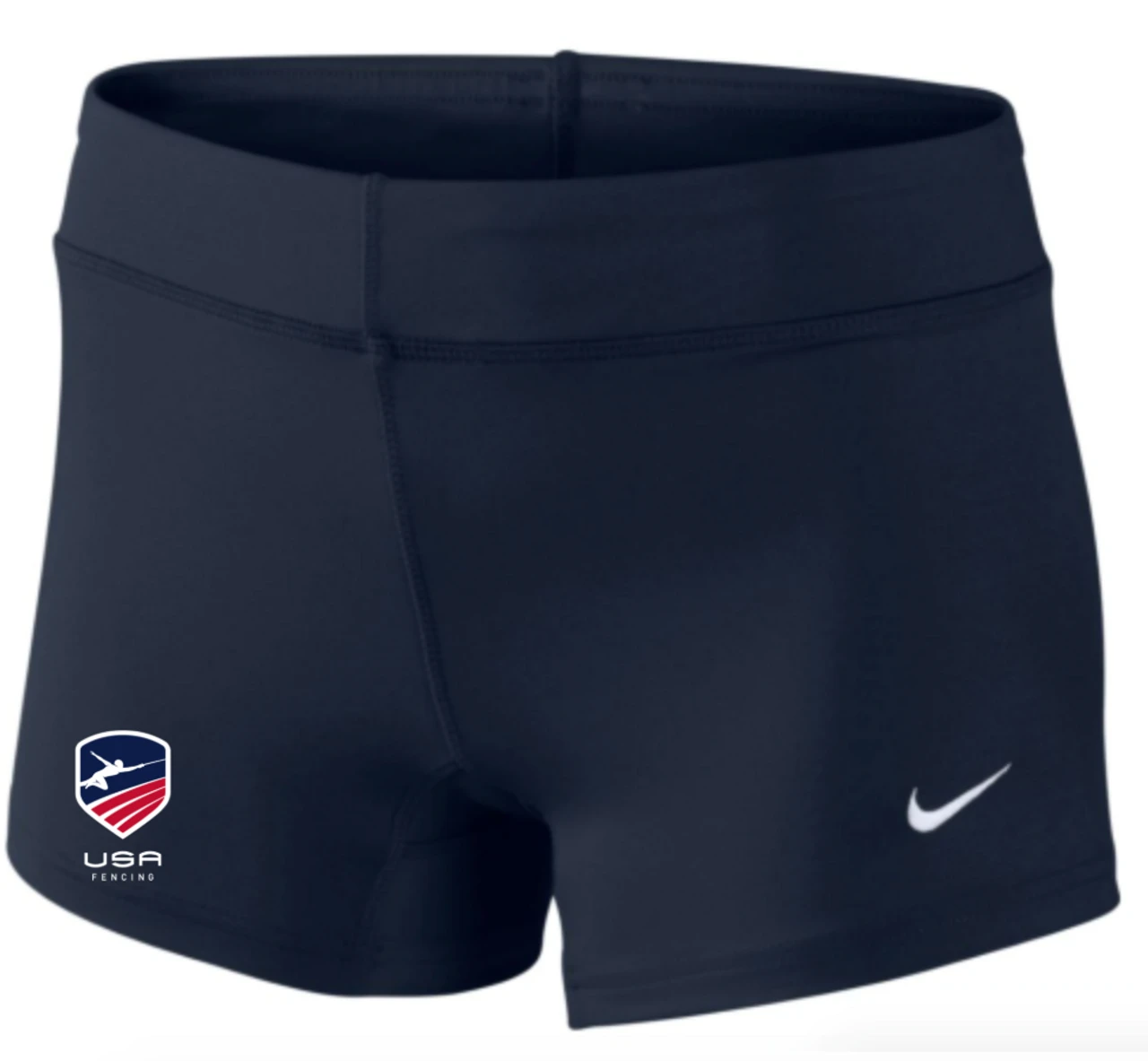 Nike Women’s USA Fencing Performance Game Short – Nike Women’s USA Fencing Performance Game Short are a performance Dri-FIT fabric short with elastic waist. Lined crotch gusset and embroidered Nike Swoosh design trademark at the lower left leg. Hip width: 16.75″, Inseam length: 3.75″ (size medium). Fabric: 82% polyester / 18% spandex.