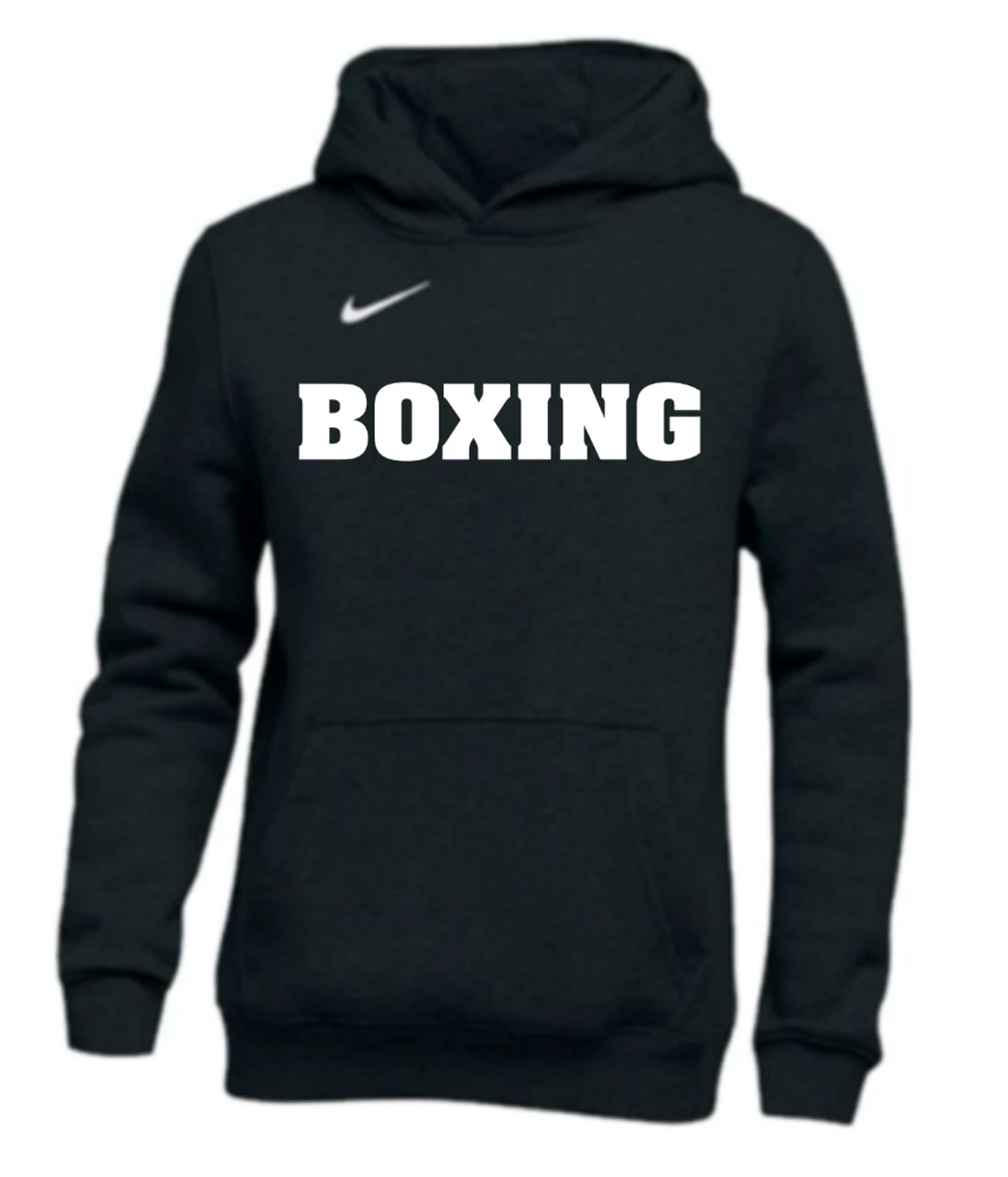Nike Youth Boxing Pullover Club Fleece Hoodie – Long Sleeve hooded fleece with “V” at center front neck. Knit rib sleeve cuff and waistband. Drawcord at neck opening and lined hood. Center front pocket. Embroidered Nike swoosh design trademark located centered below neck opening.