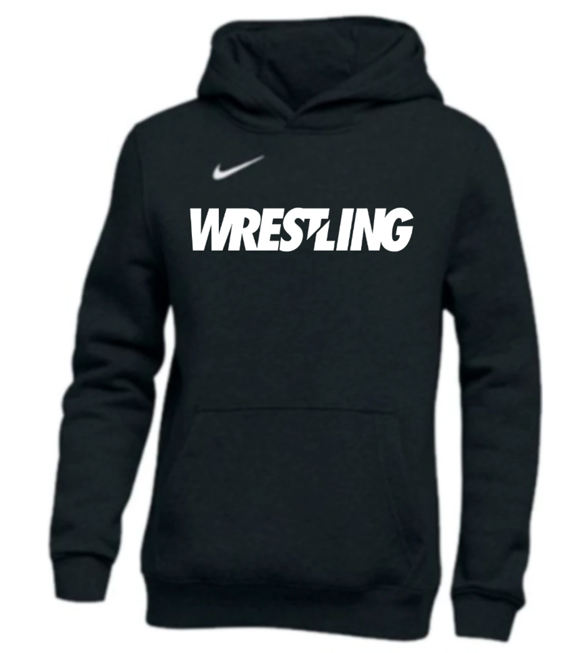 Nike Youth Wrestling Pullover Club Fleece Hoodie – Long Sleeve hooded fleece with “V” at center front neck. Knit rib sleeve cuff and waistband. Drawcord at neck opening and lined hood. Center front pocket. Embroidered Nike swoosh design trademark located centered below neck opening.